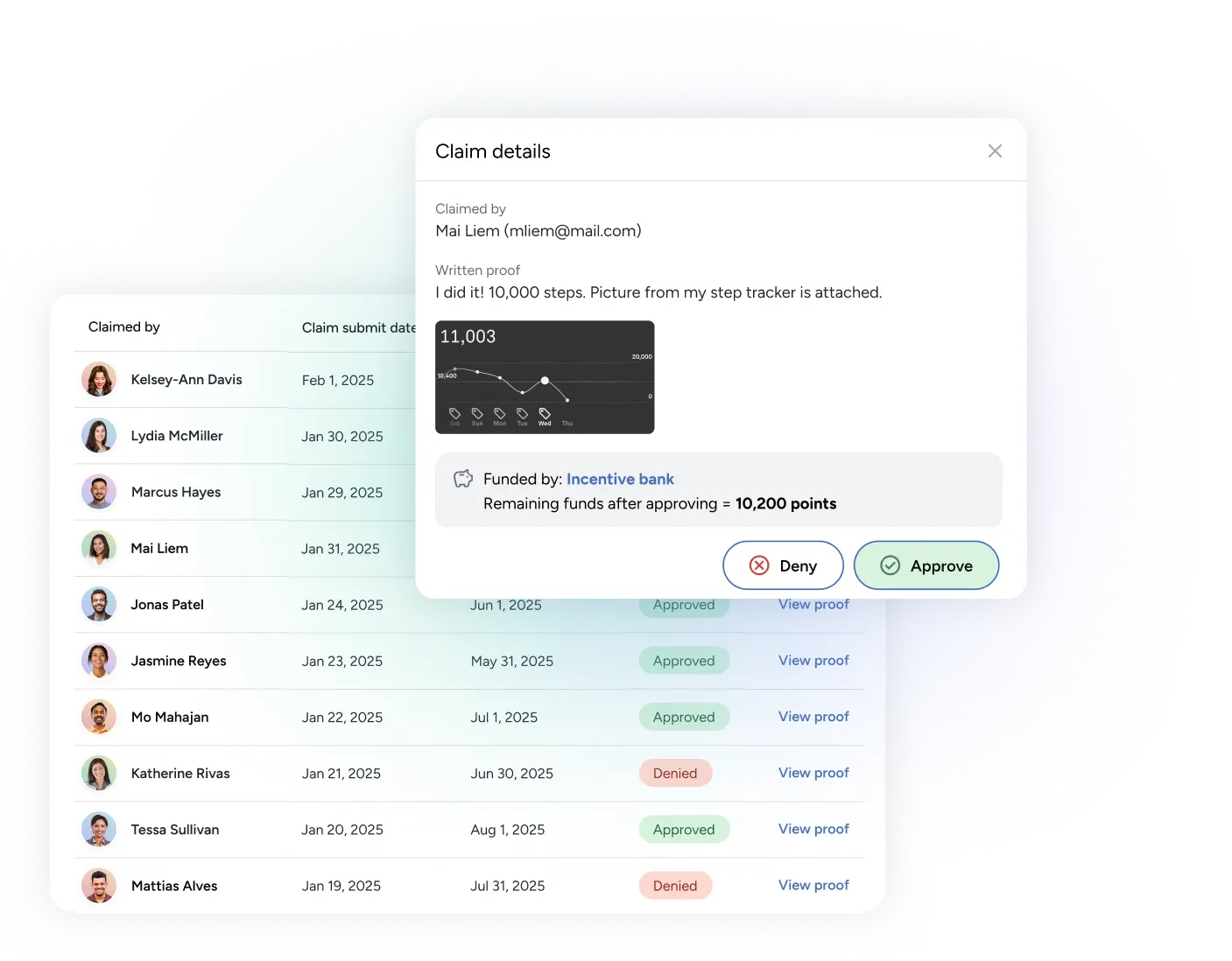For every incentive, you determine if the user must submit proof of completion along with the incentive claim. Proof is captured and stored right within the Kudos platform for quick and easy review.